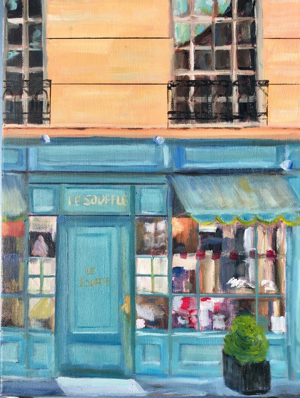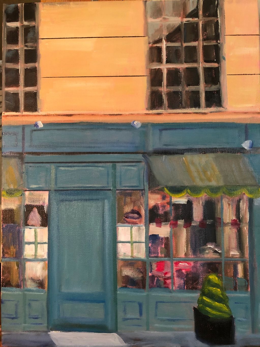 Critique: wall lines too strong, angles on bottom of the painting a bit off, perspective of planter box a bit off. I also noticed I placed the signage on the wrong panel!