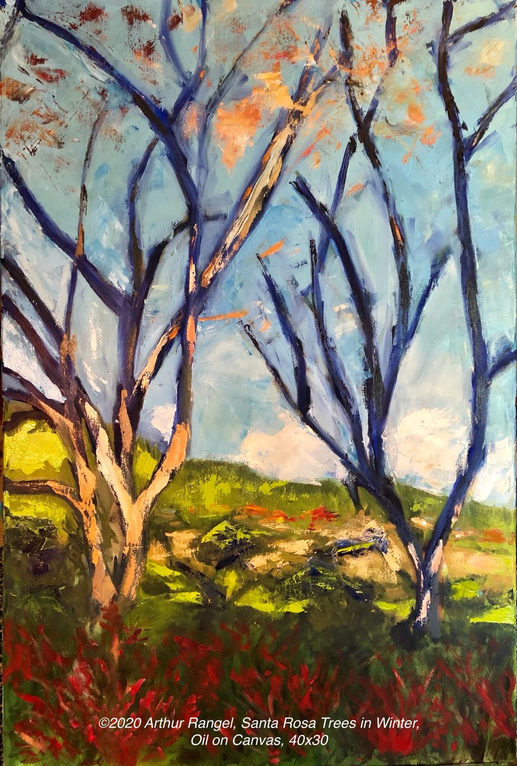 This was a fun quick large painting of some bare trees in the Valley of the Moon in Santa Rosa. I loved the reflected light. I decided to retouch the sky using a palette knife and then proceeded to add the brown leaves on the trees and the red bushes in the foreground using the same technique.